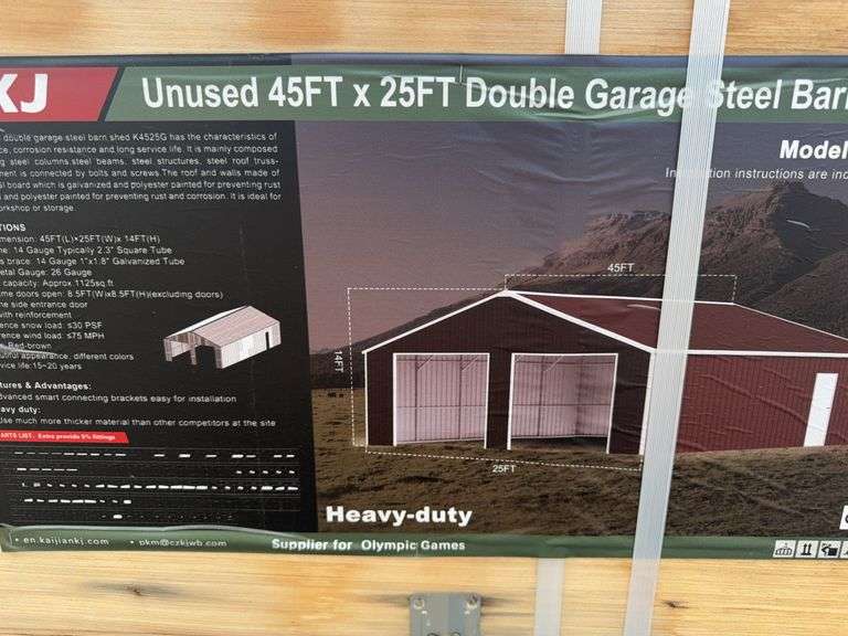 Include Box A+B. Specifications: 14 gauge/16-gauge primary frames / 29-gauge metal roof. Overall dimension: 45'L x 25'W x 14'H. Storage capacity: Approx. 1125 sq.ft. Wall height: 105.5". Two frame doors open: 102"W x 102"H (excluding doors). With one side entrance door. Roof with reinforcement. Wind rate: =75MPH. Snow rate: =30PSF. Color: Cream. Weight: 3949 lbs, Size: 39"W x 88"L x 44"H